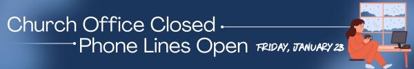 P.S. With tomorrow's forecasted extremely low temperatures, the church building will be closed to foot traffic tomorrow, Friday, January 23. The phone and email lines will remain open from 9am-4pm.